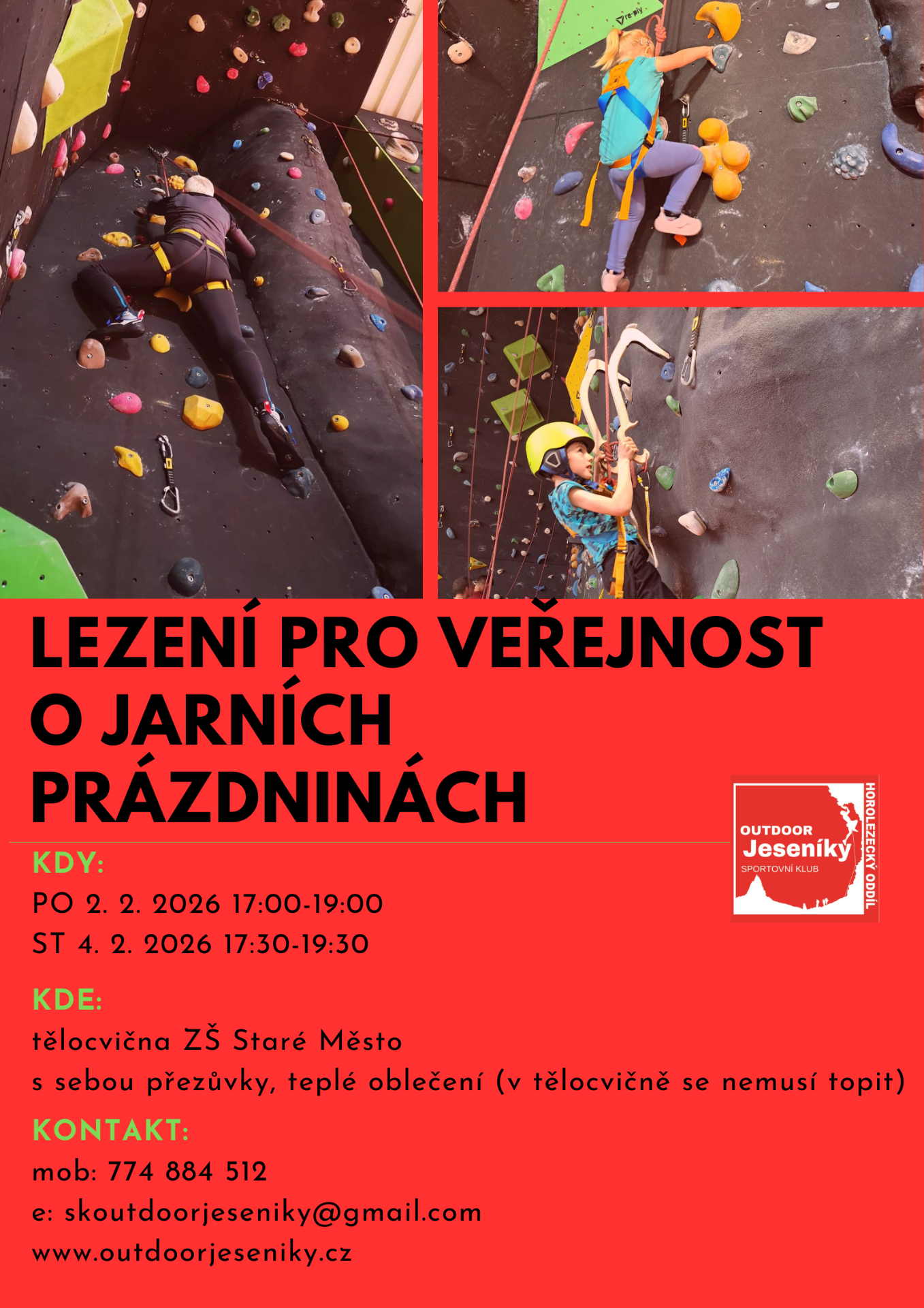 Lezení bude probíhat v tělocvičně ZŠ Staré Město. S sebou přezůvky, teplé oblečení (v tělocvičně se nemusí topit).